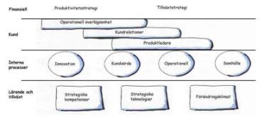 Alla mål och nyckeltal bildar en kedja av effekt och verkan samband över de fyra perspektiven. Den finansiella strategin är i regel en kombination av både en tillväxt- och en produktivitetsstrategi. Tillväxtstrategin drivs i sin tur av ett unikt kunderbjudande. Företaget konkurrerar om kunder baserat på operationell överlägsenhet, nära kundrelationer eller genom att erbjuda innovativa produkter. Alla dessa strategier ställer i sin tur krav på företagets interna processer. Slutligen bestämmer de interna processerna vilka kompetenser, teknologier och vilken företagskultur som företaget behöver för att genomföra strategin. Klicka på bilden för förstoring På detta sätt understödjer alla mål i de fyra perspektiven mål i högre perspektiv vilka leder till organisationens vision och strategi. Detta förhållande kan åskådliggöras i strategiska kartor som är ett hjälpmedel för skapandet av styrkort och visualiseringen av orsak verkan samband. | ||