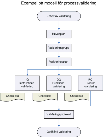 Varje företag eller organisation skapar sina egna rutiner anpassade för den egna verksamheten. Nedan beskrivs förenklat ett exempel på hur en validering skulle kunna gå till.